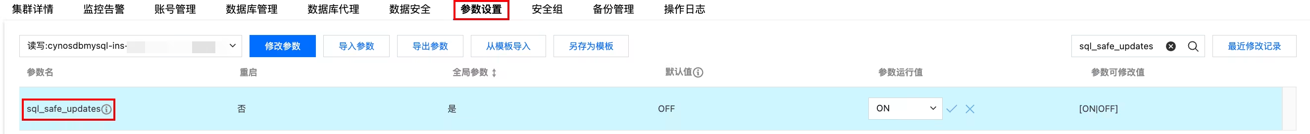 safe-updates 为数据库的一种安全模式,在应用 bug 或者数据库管理员误操作的情况下,会发生对全表进行更新:update delete 的情况。TDSQL-C MySQL 版提供 sql_safe_updates 参数来限制此操作。