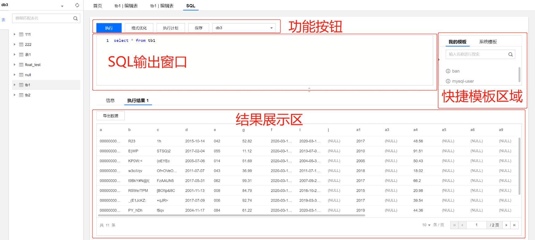 登录 DMC 控制台,单击顶部导航中的 SQL 窗口,或者左侧栏表格操作菜单中的 SQL 操作进入 SQL 窗口页面。SQL 窗口支持如下功能: SQL 命令执行及结果查看