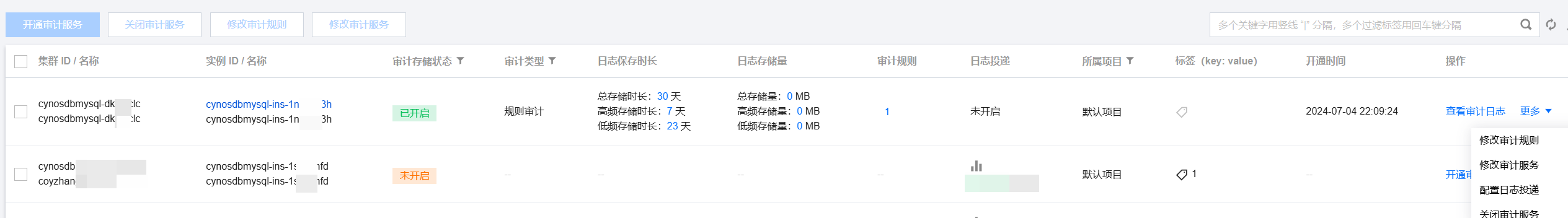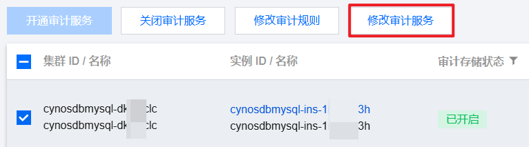 4. 在审计实例列表里找到目标实例(也可在搜索框通过资源属性筛选快速查找),在审计实例列表页勾选多个目标实例,单击上方修改审计服务。