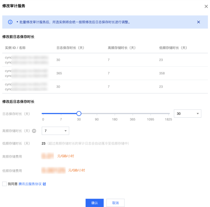 为方便对比,批量修改审计服务窗口会展示修改前后的日志保存时长,修改后,所选实例会统一开始按新的日志保存时长进行调整,请确认无误后再进行修改。