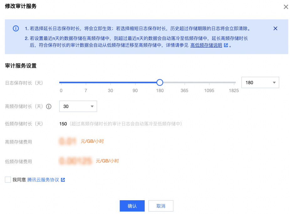 5. 在审计服务修改窗口下,修改日志保存时长或高频存储时长后,单击确认。