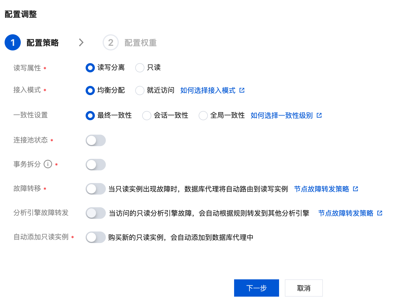 故障转移(读写属性为读写分离) | 设置是否开启,开启后,数据库代理出现故障时,连接地址将会路由到主实例。 |