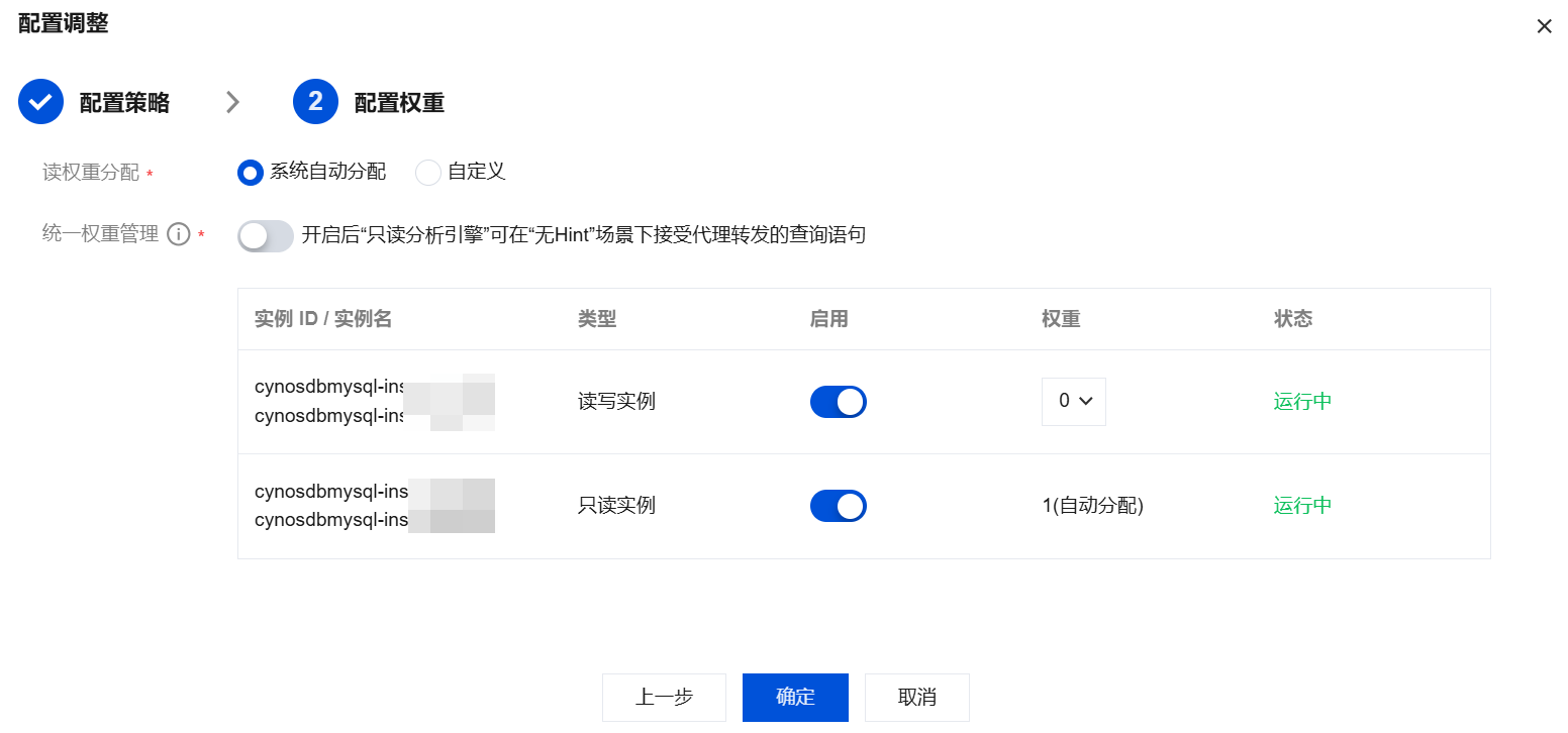 自动添加只读实例 | 设置是否开启,开启后,若您购买新的只读实例,会自动添加到数据库代理中。 当读权重为系统自动分配时,新购只读实例按照规格大小默认权重分配。 当读权重为自定义时,新购只读实例默认加入时权重为0,可通过数据库代理页,连接地址下的调整配置来修改。 |
