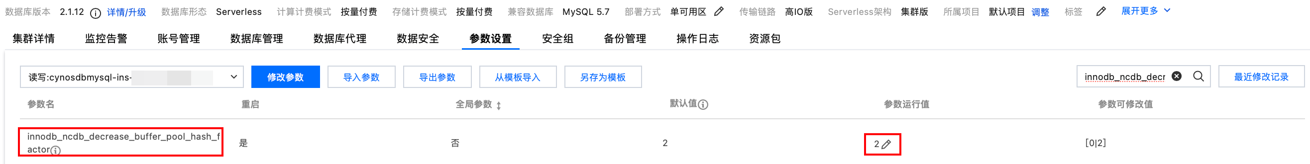 innodb_ncdb_decrease_buffer_pool_hash_factor | 是 | 否 | 2 | 0 | 2 | 调整缓冲池大小线程的频率会减小哈希表的大小。 值为2是关闭状态,表示当缓冲池减少超过1/2时,哈希表大小将被更新。 值为0是启用状态,表示哈希表大小不会更新。 说明: 当此参数为启用状态时,更改节点算力配置上限会重启实例。 |