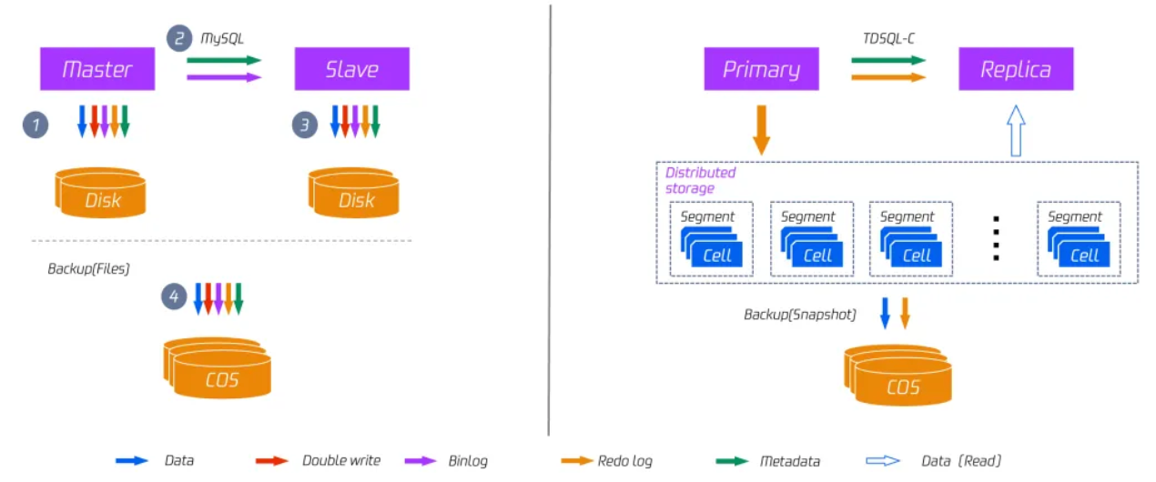 内核团队在用官方 MySQL 8.0 测试过程中,发现缩容的主要瓶颈在于 flush lru list,因为大部分场景下,第一遍扫描 free list 都是不能满足回收要求的,而且根据需要回收的 block 数量来确认 scan depth,可能是一个比较大的值。buf_flush_do_batch 需要刷脏,持久化 page,在此过程中也会频繁的获取和释放 lru mutex,和用户线程竞争,产生毛刺。其中持久化 page 涉及 IO 操作,是主要瓶颈。这个问题在 TDSQL-C MySQL 版的架构上可以完全规避,因为分布式存储上的 page 都是由 redo log 在存储层 apply 异步生成的,计算节点不需要刷脏,需要淘汰的 page 可以直接丢弃。产品架构如下图所示。