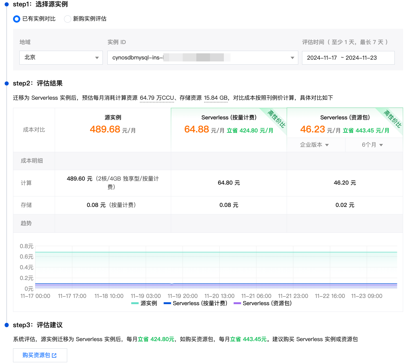 4.2. 评估结果。您可在此步骤中查看源实例、使用 Serverless(按量计费)、使用 Serverless(资源包)这三种方式的成本对比。