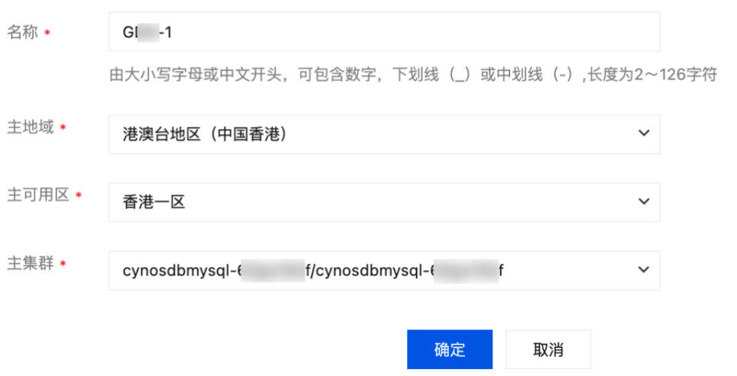 主集群 | 选择一个已有集群作为 GD 的主集群。 说明: 主集群需已开启数据库代理,且读写实例规格在4核及以上。 |