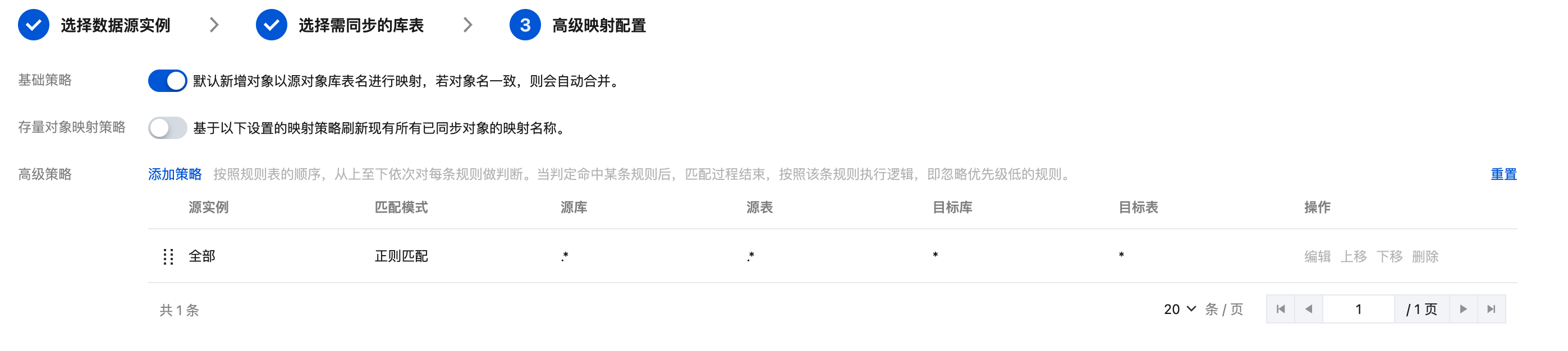 默认基础策略为激活状态,激活的基础策略会在下方策略表格的首行新增一条策略信息。规则为所有同步到分析集群的对象都将按照原库名和原表名进行映射。当存在库名和表名相同的表时,则会自动合并。如果表结构不一致,则查询会报错。可以手动添加其他高级策略,让指定实例的库表映射为其他名称。