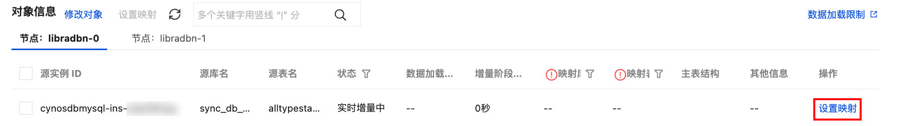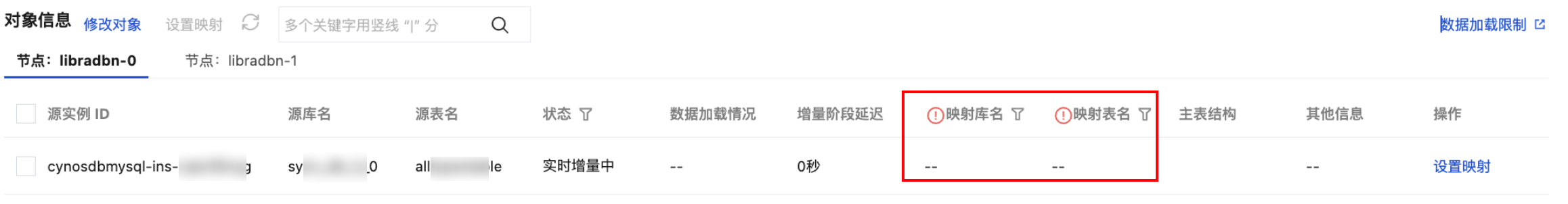 如果存在已同步的对象没有映射名称,则会在映射库名和映射表名前标记红色感叹号,您可通过此标记快速了解是否设置了库表映射。