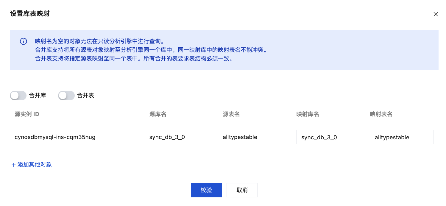 目标表 | 支持输入需要映射的表名称。若勾选“与原对象名保持一致”,则此选项默认为 *,代表同步到分析引擎的映射表名不变。 |