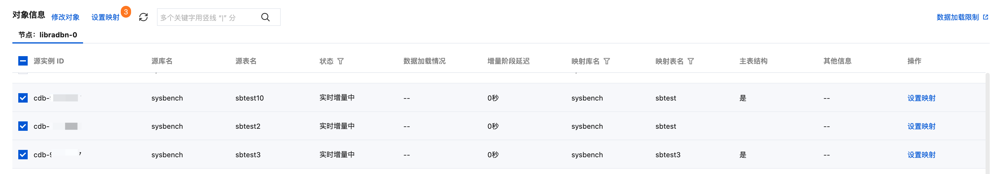 根据默认规则强制设置所有库表映射名:默认规则为将所有同步到分析集群的数据库以“数据库名_实例 ID”格式进行命名。例如数据库 database1 的源端实例为 cdb-af321a3,则激活此按钮后,此数据库的映射名称为“database1_cdb-af321a3”。