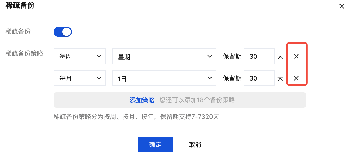 4. 在弹窗内的快照备份 > 高级设置 > 稀疏备份下,单击删除多余的稀疏备份策略,然后单击确定。 关闭稀疏备份
