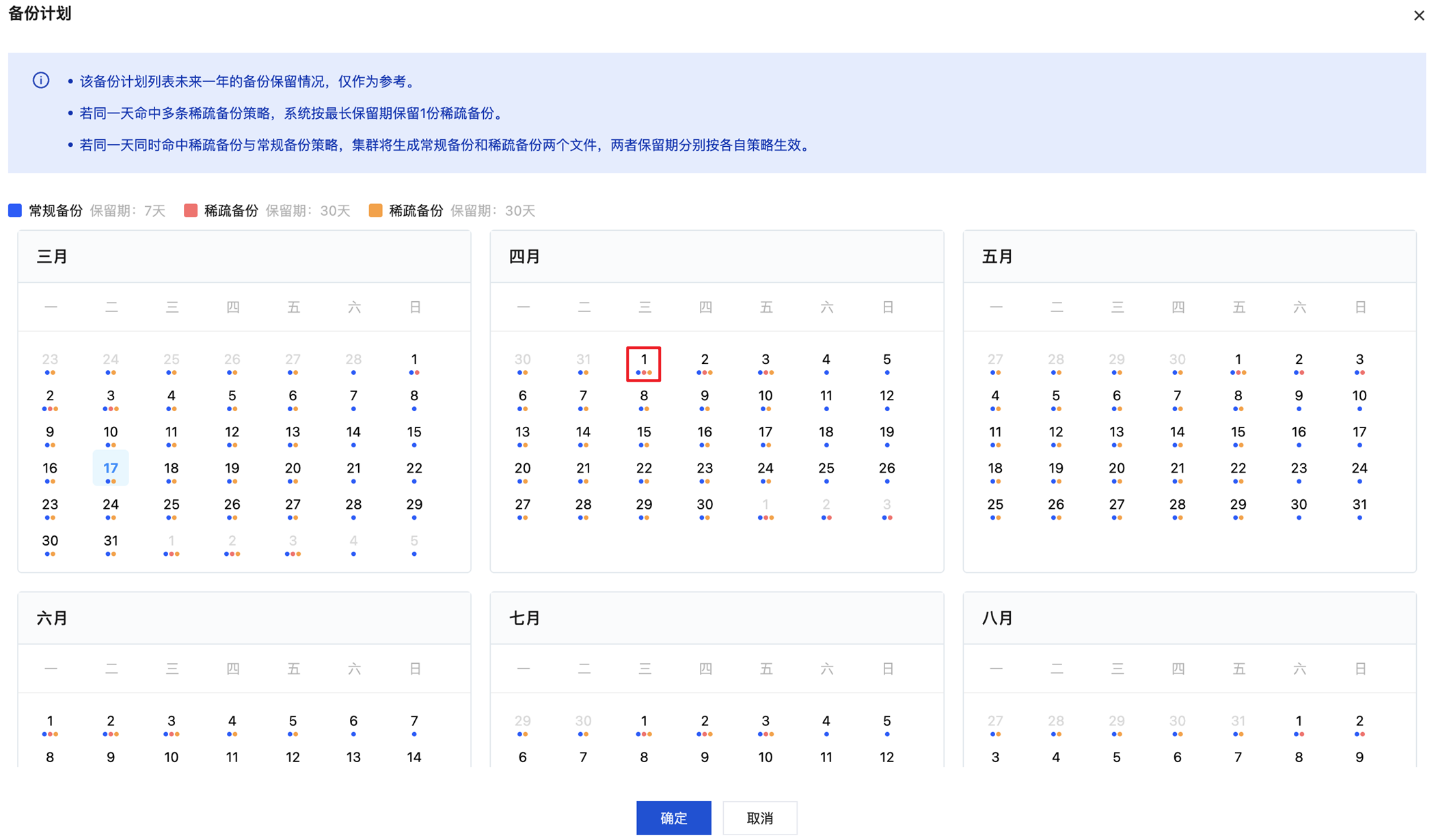 备份计划展示区分常规/高频/稀疏备份,若当天命中多条备份策略,则会展示全部备份类型,如上图所示,红框标注的当天展示为命中1条常规备份与2条稀疏备份情况。