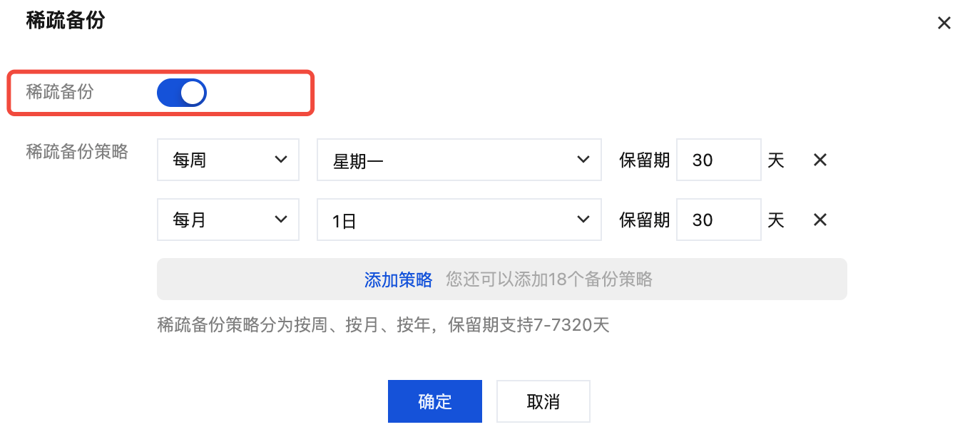 稀疏备份策略 | 开启稀疏备份功能后,需要设置的备份保存策略,您可以设置备份的保存周期和保存时长。 |