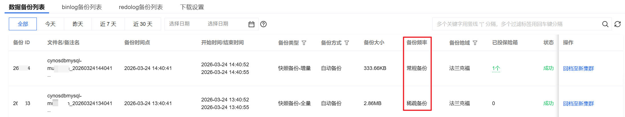 4. 您可在数据备份列表下的备份频率字段查看到对应备份集是稀疏备份还是常规备份。