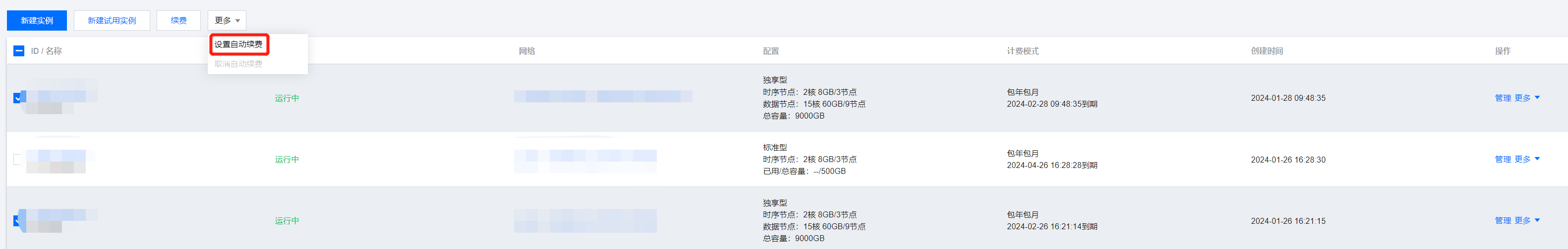 2. 在实例列表上方,选择更多 > 设置自动续费。