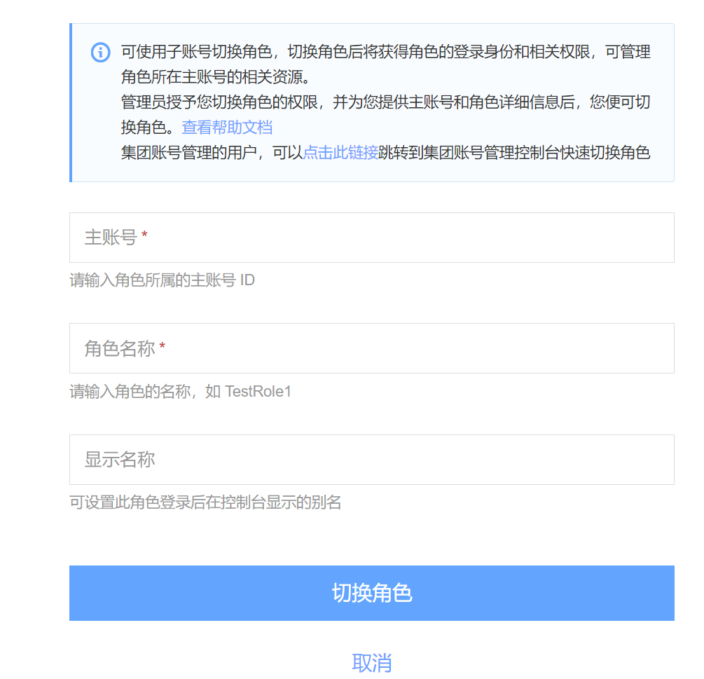 2. 在切换角色页面,输入公司 A 的主账号,以及角色名称。单击切换角色,即可切换为公司 A 的角色身份。如下图所示: