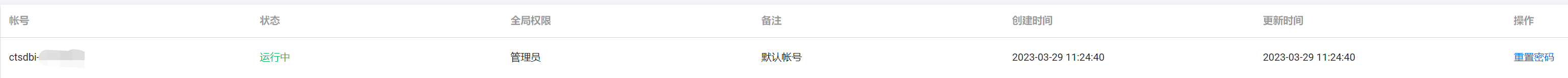5. 选择账号管理页签,在账号列表中,找到所需重置密码的账号,单击其操作列的重置密码。