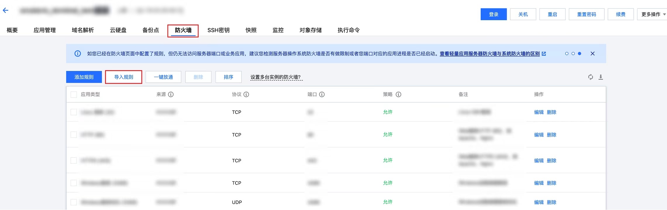 上述默认放通的端口,实例创建完成后您可以根据自身业务需求,在实例详情页防火墙页面手动修改策略为“拒绝”或者删除防火墙规则(删除后默认不通)。