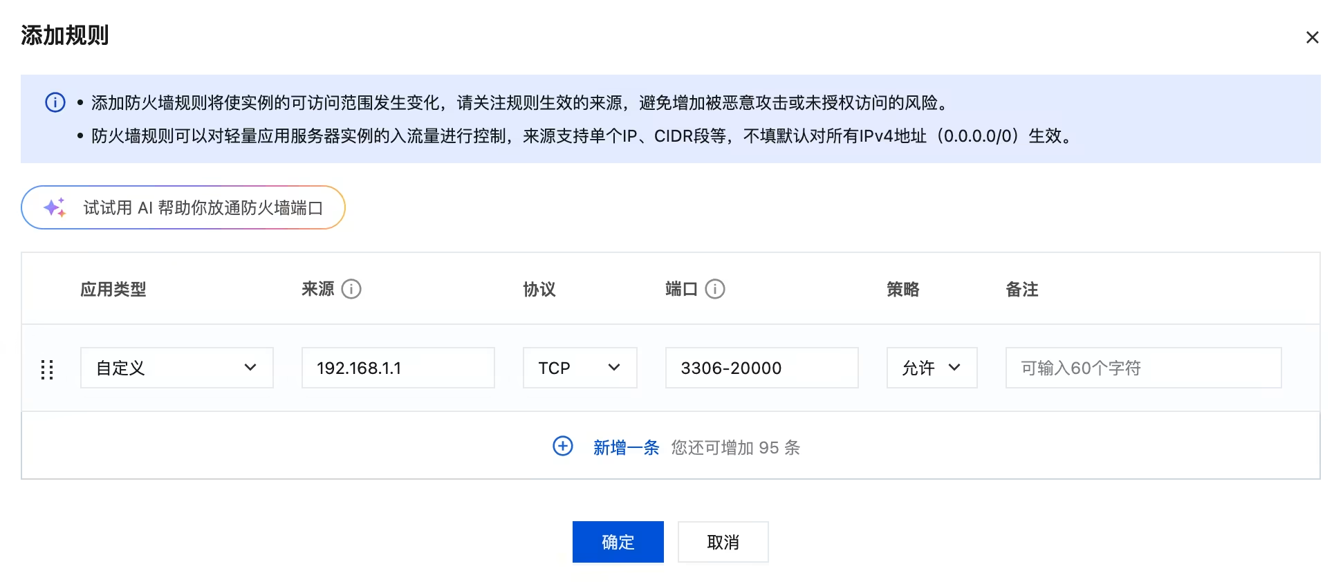 本文以添加放通来源 IP 为192.168.1.1,协议类型 TCP,端口为3306-20000的规则为例。请您结合实际情况进行操作,规则参数说明请参见 组成部分。 注意: