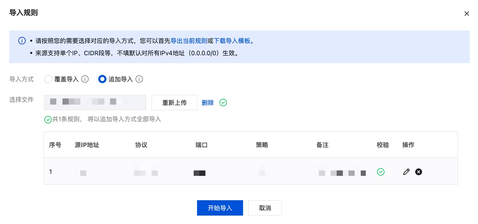 覆盖导入规则:选择文件中的规则将覆盖防火墙模板的原有规则。