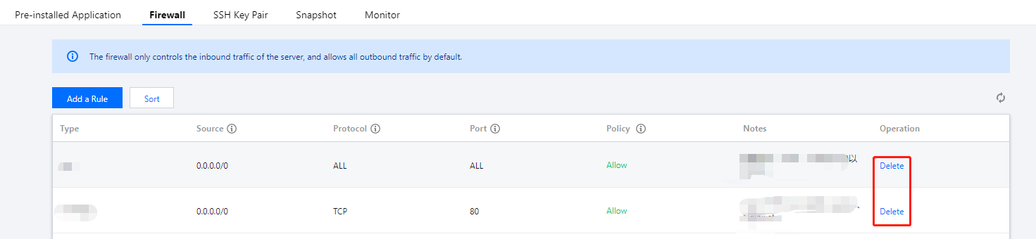 3. 在防火墙页签中,选择需要删除的防火墙规则所在行右侧的删除。如下图所示: