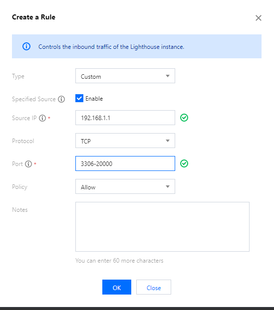 本文以添加放通来源 IP 为192.168.1.1,协议类型 TCP,端口为3306-20000的规则为例。请您结合实际情况进行操作,规则参数说明请参见 组成部分。