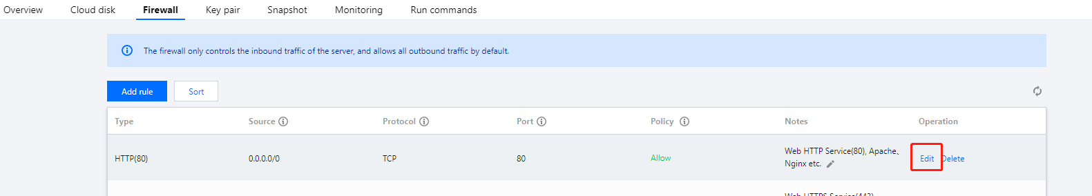 轻量应用服务器创建后,默认放通 ICMP 协议,默认开启80端口( HTTP 服务)、443端口( HTTPS 服务)、22端口( Linux SSH 服务)和3389端口( Windows RDP 服务)。
