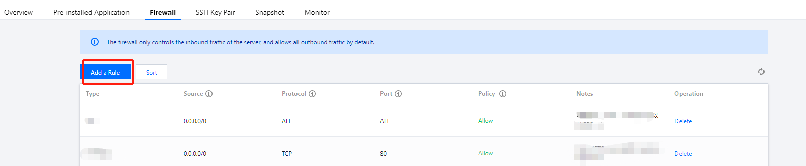 2. 在实例详情页中,选择防火墙页签,并单击添加规则。如下图所示: