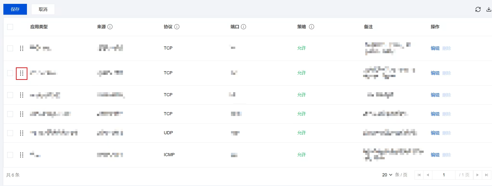 3. 选择需调整规则前的 ,拖动至所需位置后松开鼠标。如下图所示: 4. 单击列表上方保存即可完成防火墙规则优先级调整。