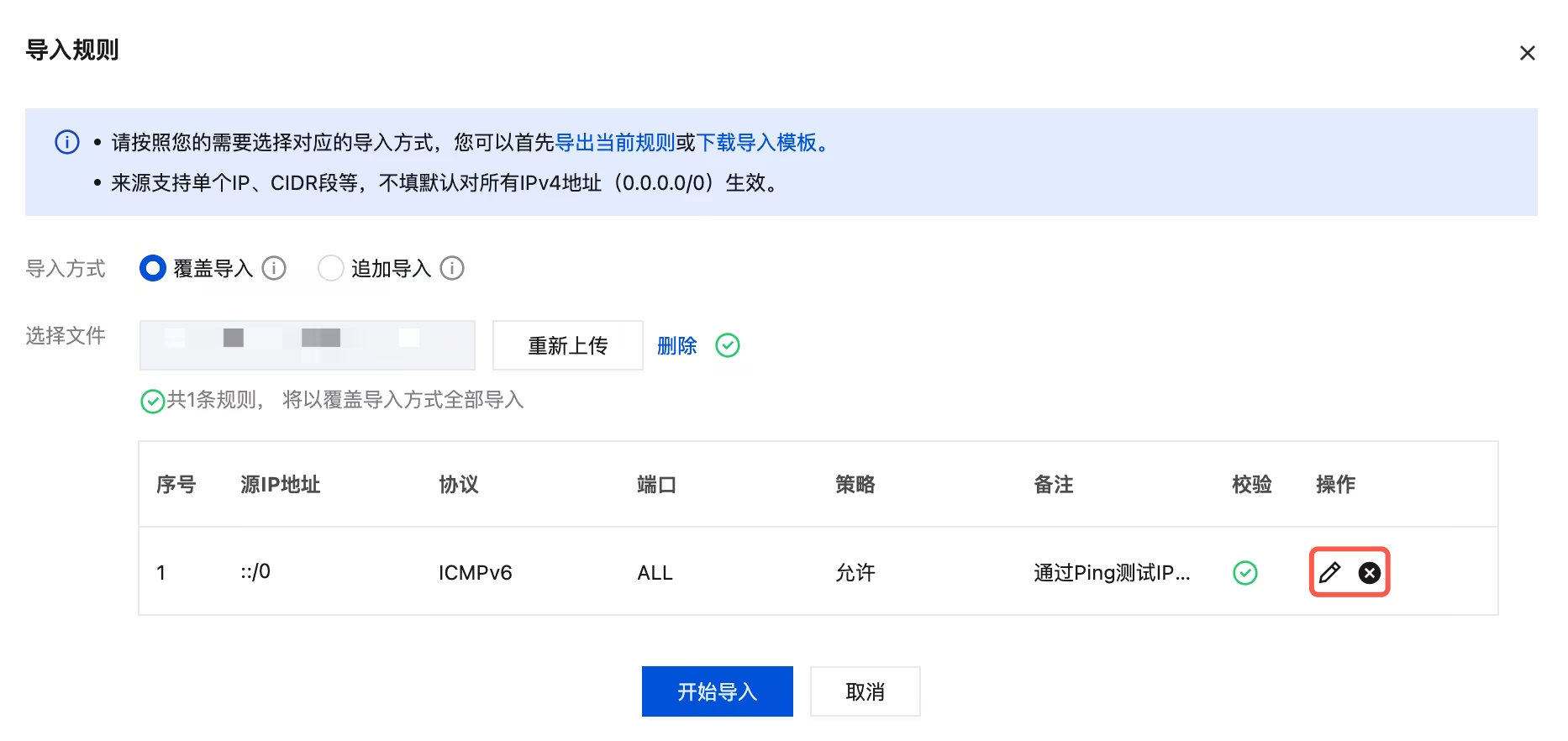 上传规则后,您可通过操作列对整行规则进行编辑,也可删除整行规则。如下图所示:
