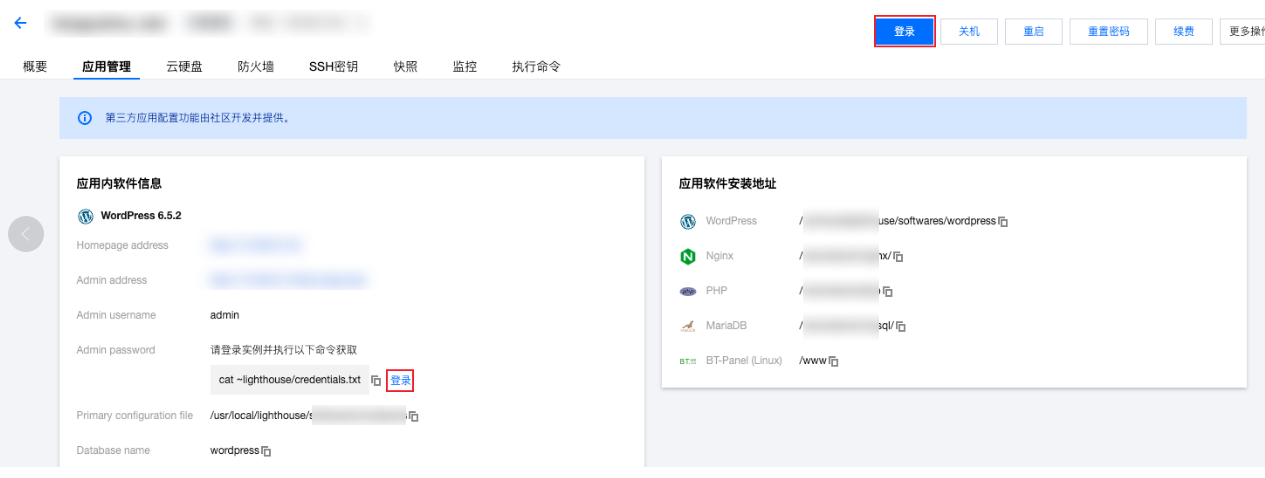 ,单击 ,复制获取 WordPress 管理员账号及密码的命令。 4. 在“应用内软件信息”栏中,单击登录。如下图所示: