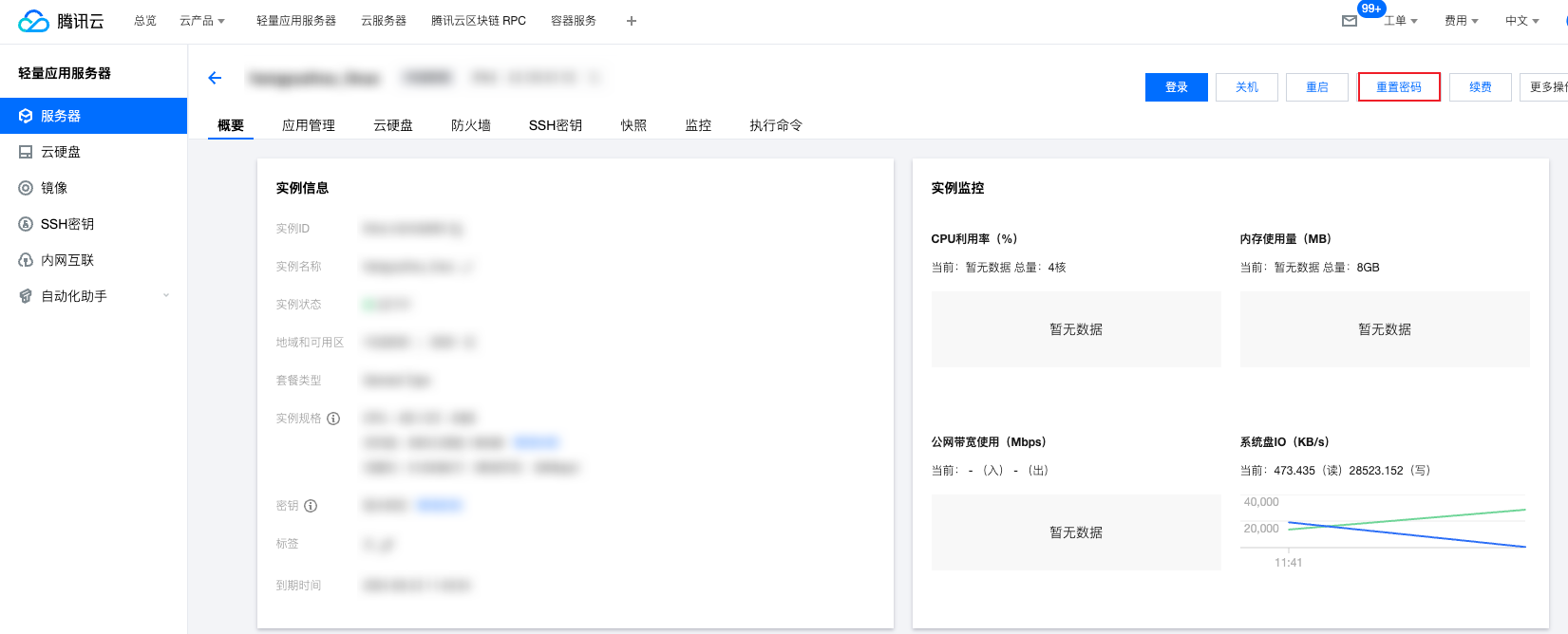 如果您需要使用 SSH 或者远程登录软件连接 Linux 实例,请先 重置密码 或 设置密钥。此步骤以重置密码为例,请结合实际情况按需操作。 2. 在服务器详情页中,单击页面右上角的重置密码。如下图所示: