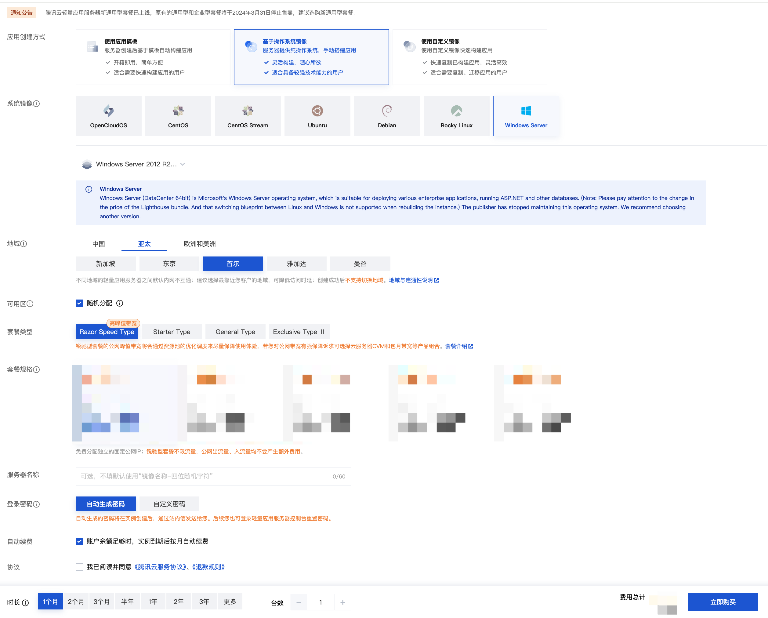 2. 单击新建,进入轻量应用服务器购买页面。如下图所示:
