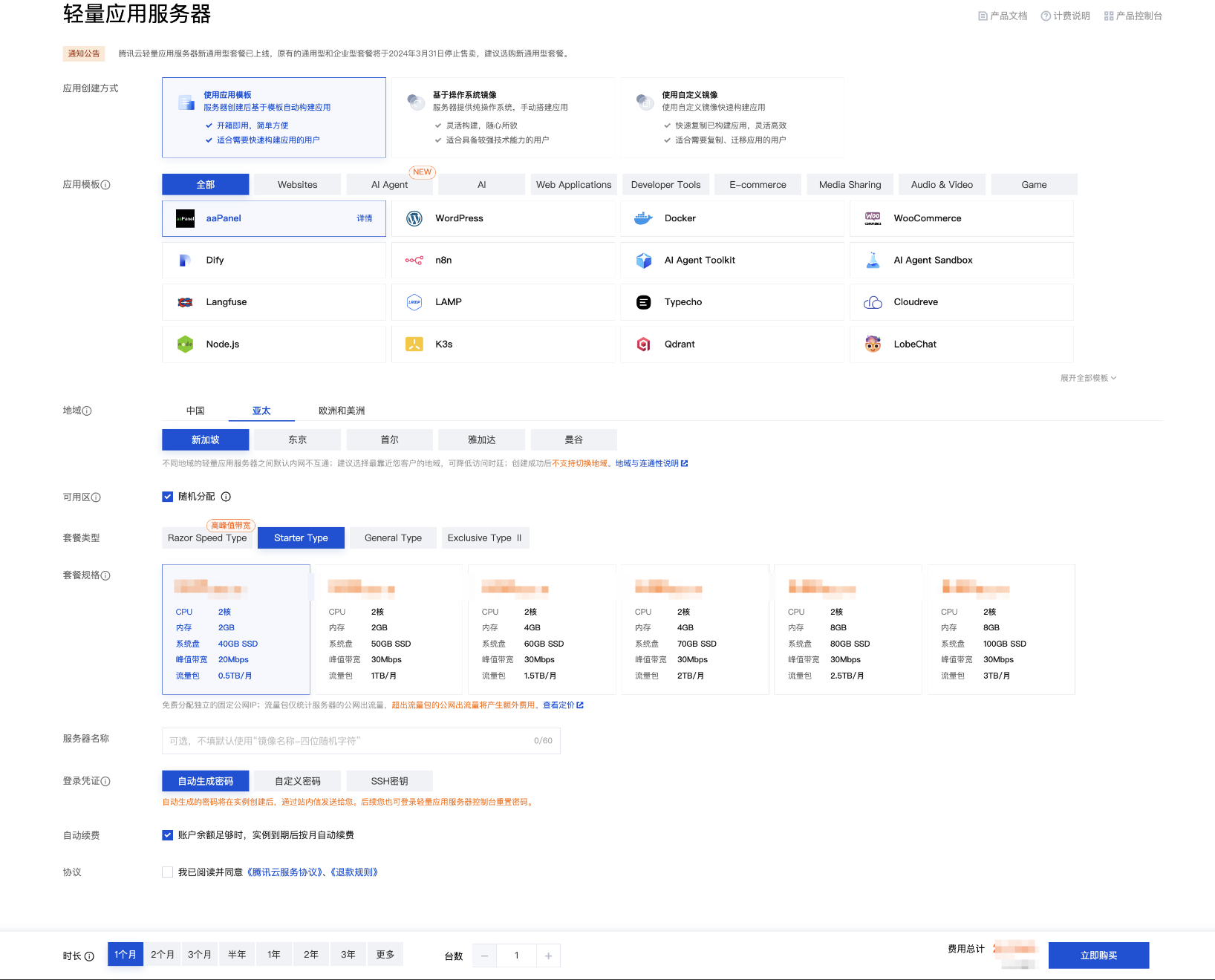 您可勾选账户余额足够时,实例到期后按月自动续费,开启实例自动续费功能。当实例创建成功后,可参考 自动续费 修改已有的自动续费设置。 台数:表示需购买轻量应用服务器的数量。