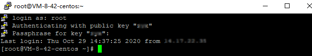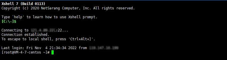登录完成后,命令提示符左侧将显示当前登录轻量应用服务器的信息。 通过 Xshell 进行登录演示