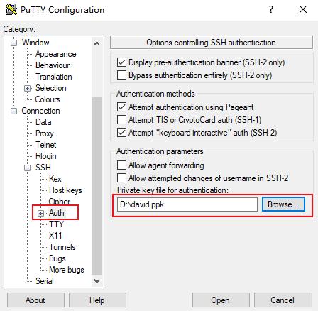7. 在左侧导航栏中,选择 Connection > SSH > Auth,进入 Auth 配置界面。