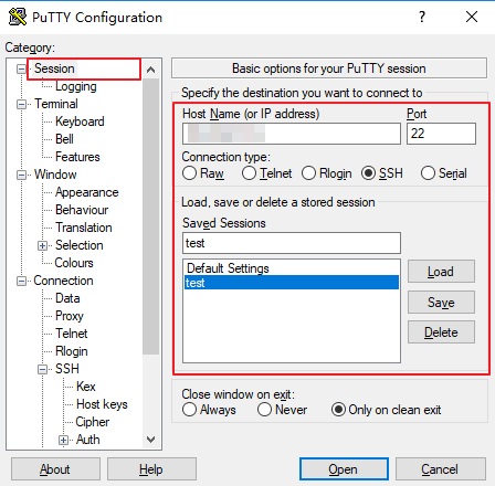 Saved Sessions:填写会话名称,例如 test。