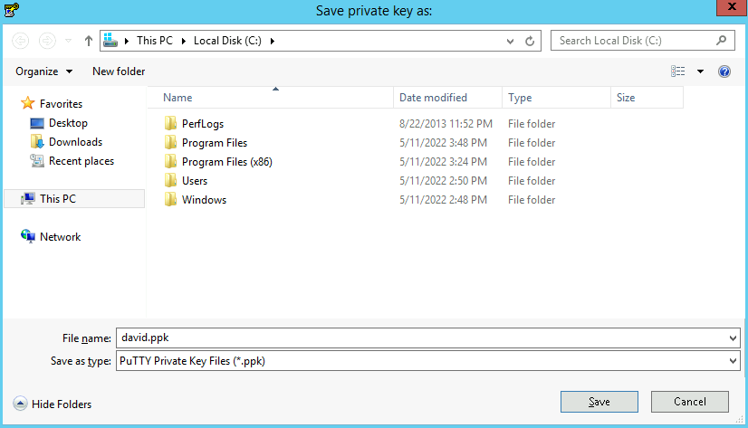 5. 在弹出的窗口中,选择您存放密钥的路径,并在文件名栏输入“密钥名.ppk”,单击保存。例如,将 david 私钥文件另存为 david.ppk 密钥文件。如下图所示: