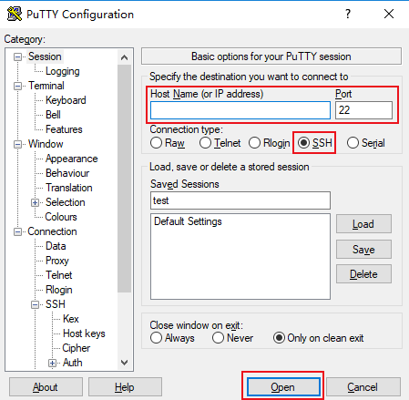 3. 在 PuTTY Configuration 窗口中,输入以下内容。如下图所示: