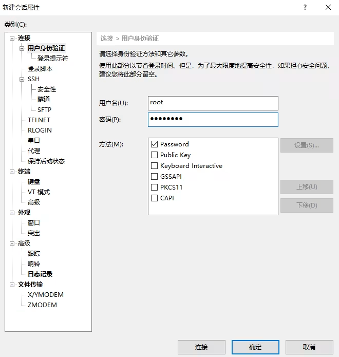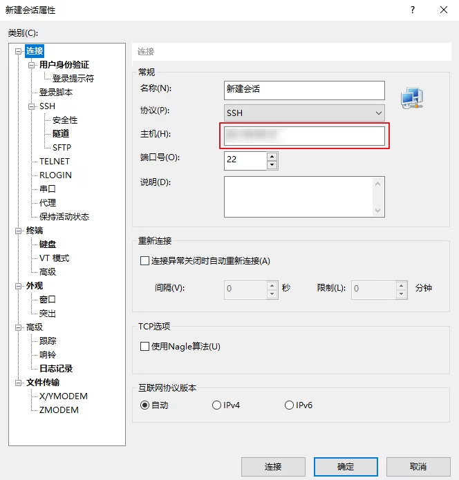 9. 切换至 Session 配置界面,配置服务器的 IP、端口,以及连接类型。如下图所示: