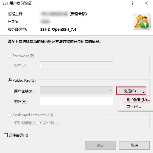 5. 单击浏览 > 用户密钥,选择从腾讯云轻量应用服务器创建的密钥,单击确定。