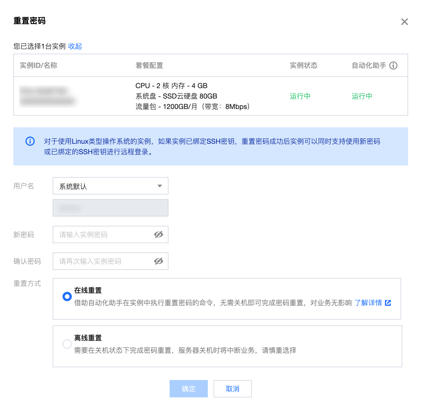 如您选择在线重置密码,则需要确保您选择实例的实例状态与自动化助手状态均为运行中。