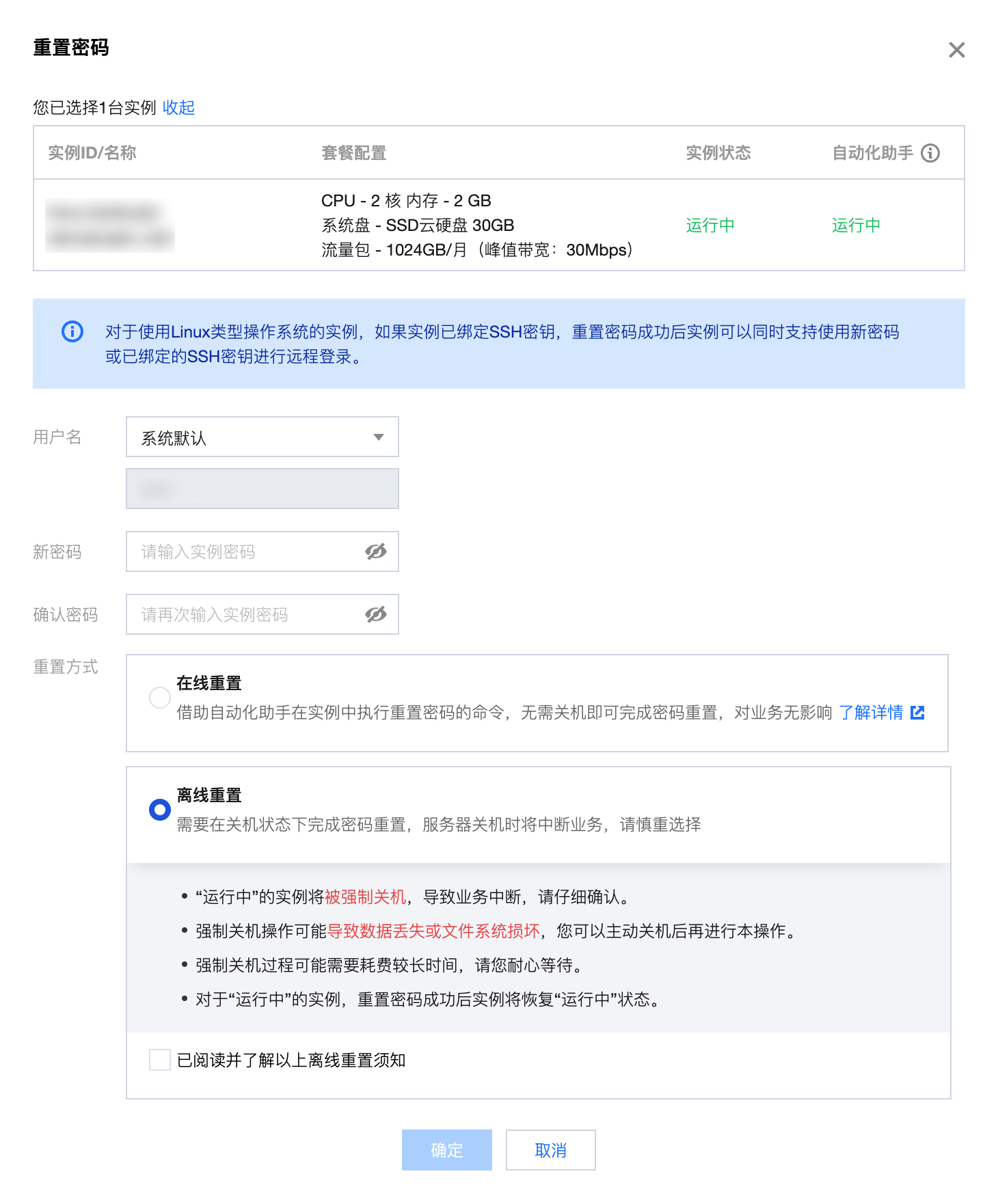如您选择离线重置密码,对于正在运行的实例,在重置密码的过程中会关闭服务器。建议在业务低谷时进行此操作,以降低关闭服务器带来的影响。