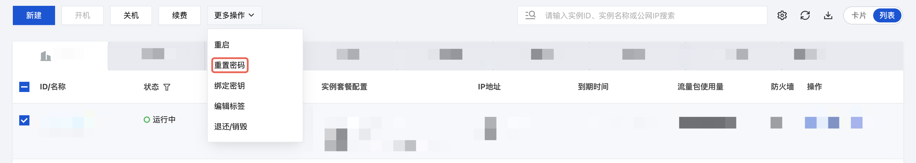 重置多台实例密码:在实例列表中,勾选要重置密码的实例,单击上方的更多操作 > 重置密码。