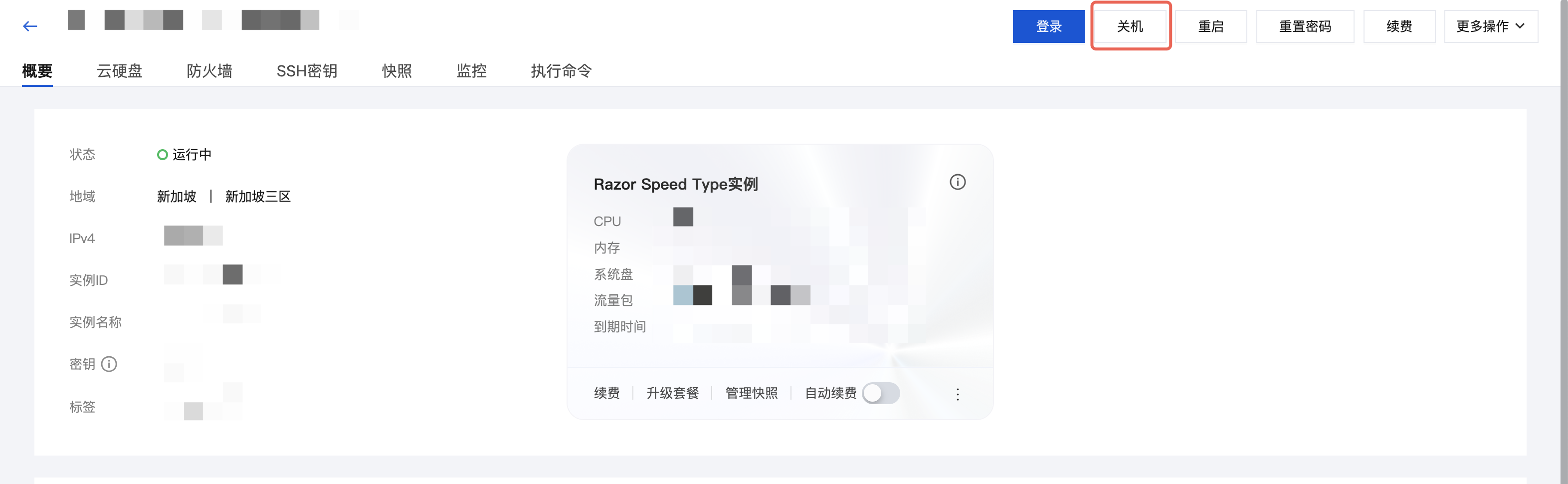 实例关机后,将无法提供服务。因此在关机之前,请确保轻量应用服务器已暂停业务请求。