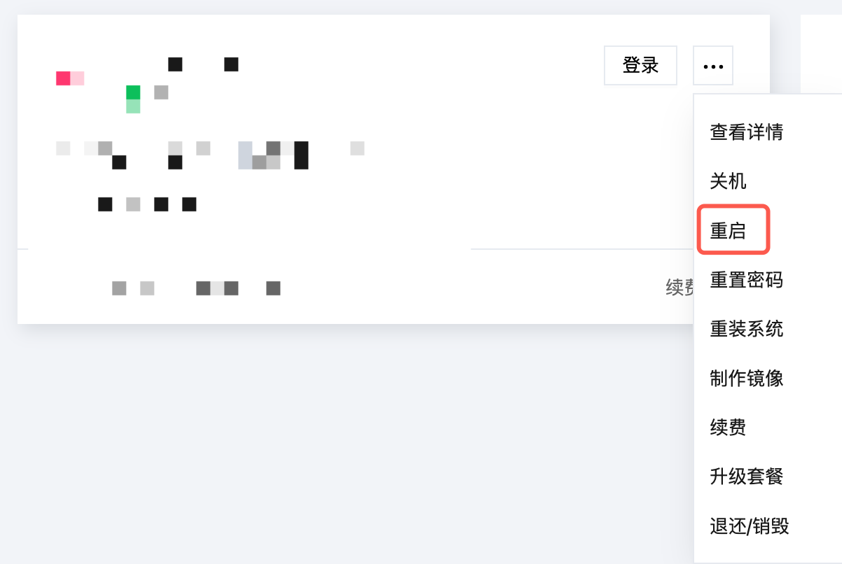 在服务器列表中的实例卡片上,单击 > 重启。如下图所示: 进入服务器详情页,单击页面右上角的重启。如下图所示: