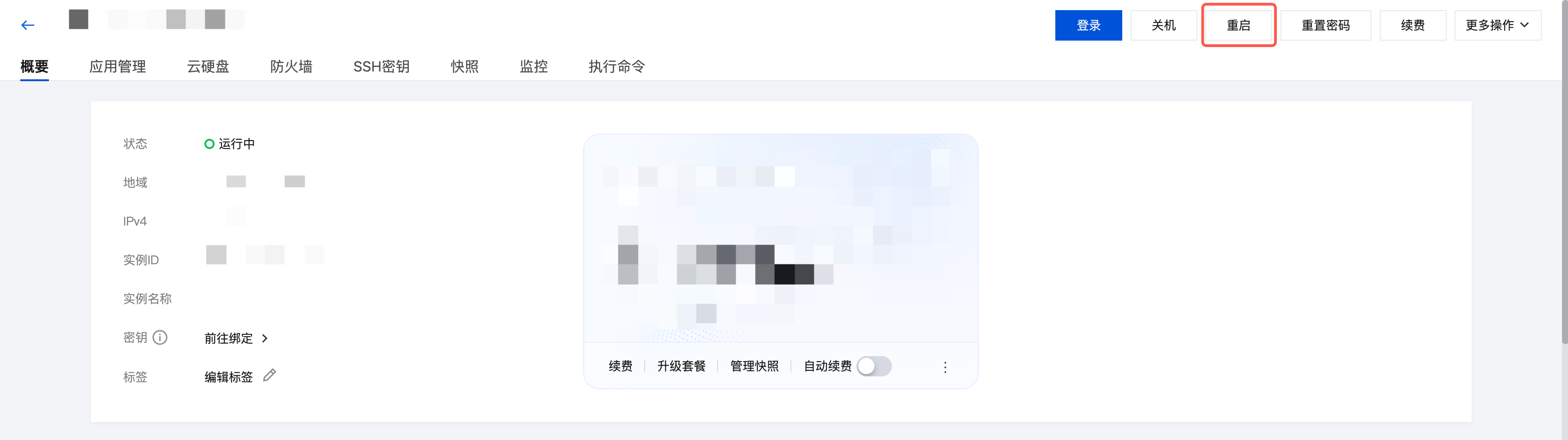 重启准备:重启期间实例将无法正常提供服务,因此在重启之前,请确保轻量应用服务器已暂停业务请求。