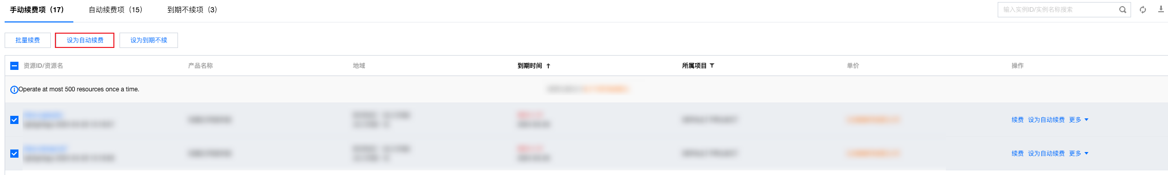 3. 在续费管理页面,勾选需设置自动续费的实例,并单击列表上方的设为自动续费。如下图所示: