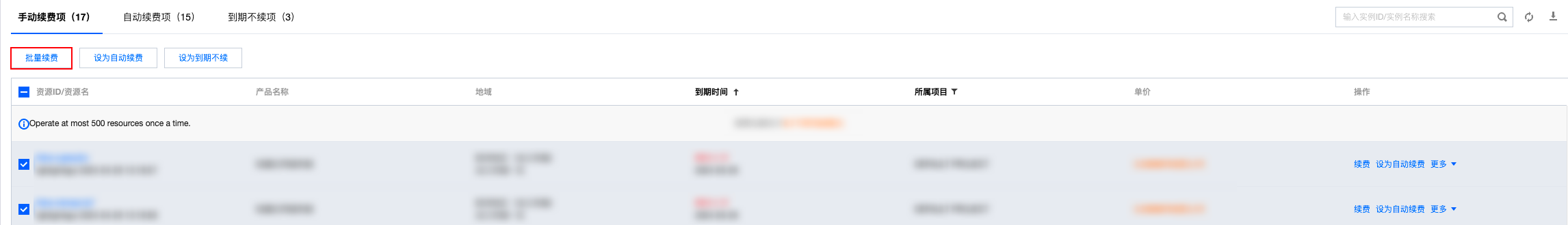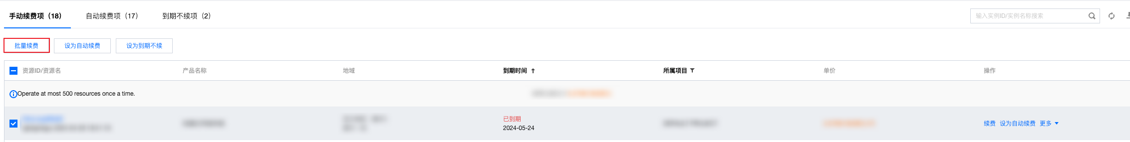 3. 在续费管理页面,勾选需续费的实例,并单击列表上方的批量续费。如下图所示: